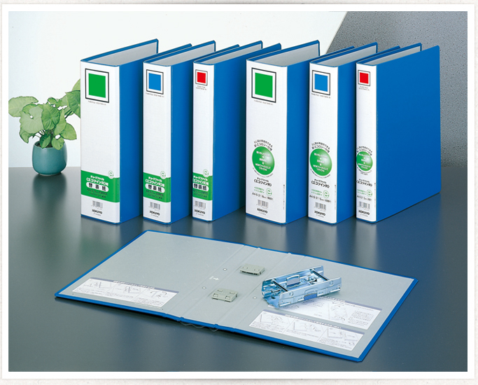 紙製品メーカーの社会的責任として、コクヨは早くから再生紙の使用などでエコに取り組んできましたが、1990年代に入って、環境問題に対する社会的関心がさらに高まってくると、いち早く独自の環境設計基準に基づいた製品アセスメントを全事業部で実施、環境対応商品の開発を積極的に進めます。93年には、その姿勢を内外に表明するために「コクヨ環境行動憲章」を制定。「チューブファイル〈エコ〉」は、同憲章制定後初の製品でした。開発に際して設定された課題は、古紙を使用することと、綴じ具に使用されている金具が分別廃棄できるよう簡単に取り外せること。ところが、これらすべてを実現するためには、生産方法から変える必要があり、さらに従来の常識を覆す「綴じ具が外れる」という仕様に、社内でははじめ反対の声が上がりました。当時はまだ分別収集について明確な規定を設けていない自治体があったことも、反対の理由になりました。これに対して担当開発部門は、分別廃棄、リサイクルが当然の時代が早晩来ることは明らかだとして(注1)、環境に配慮した商品を業界に先駆けて実現することの重要性を説いて開発をスタート、試行錯誤を繰り返しながら94年に完成、発売となりました。当初の課題は、表紙の心材に古紙100%を使用し、綴じ具の金具は、ハンマーでたたくと簡単に外れる仕様にしてクリアしました。
