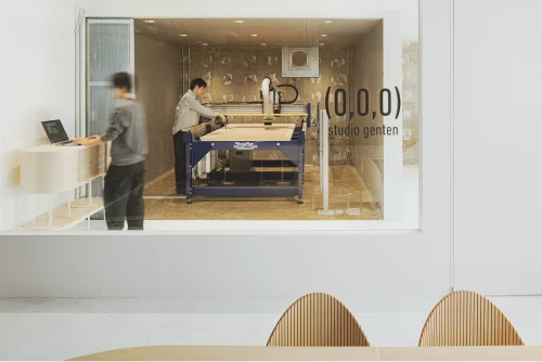 THE CAMPUS内に開設した、次世代のものづくりを探求する実験工房。この工房の核となるのが「デジタルファブリケーション技術」です。設計データをもとに、コンピュータ制御の工作機械で素材を加工。試作品や製品を効率よく製作できるものづくりの手法です。アイデアをすぐにカタチにできることで、創造性とスピードの両立を可能にします。この技術を実現するために、(0,0,0)studio gentenではVUILD株式会社のデジタル木材加工機「ShopBot®︎」を導入。3DCADで設計したデータをもとに、家具や内装、アート作品などを迅速かつ自由にカタチにできる環境を整えています。