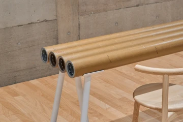 コクヨ工業滋賀から出る廃棄物の9割は紙。それを丁寧に分別し、新たな形に生まれ変わらせる挑戦を共に進めてきました。例えば、紙の端材から生まれた張地・カミカラは、コクヨの人気チェア「FABRE」などに採用されたり、原紙ロールの芯材(紙管)はデスクとしてTHE CAMPUSで使用されています。