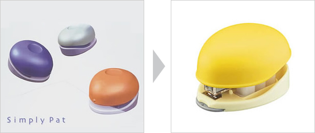 カラフルでコロンとした、かわいいフォルムが特徴のステープラー「たまほっち」。これは、2002年より開催している「コクヨデザインアワード」の初代グランプリをコクヨが商品化したものです。丸みを帯びたそのデザインは、それまでのステープラーの形状を覆すものでしたが、ボディが大きいために紙の挿入が見えにくいことが課題でした。何度も試行錯誤を重ね、ボディ部分を斜めに設定することでクリア。商品の魅力的な特徴のひとつである、たまご型のポップなデザインを実現しました。