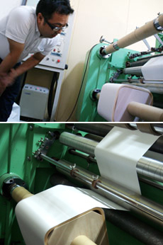 That machine was an old type of machine that allows manual operation with detailed settings. When rolling paper on a round object, you only need to apply constant tension. However, in the case of a square object, the movement when wrapping becomes jerky and it cannot wrap neatly with a constant tension. We tried it many times and while constantly adjusting the tension of the rolled paper, worked on the difficult challenge of rolling the base paper on a square.