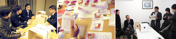 (Left) Meeting with all of the members of Kobe Design School. (Middle) Sketches of ideas. (Right) Checking the prototype.