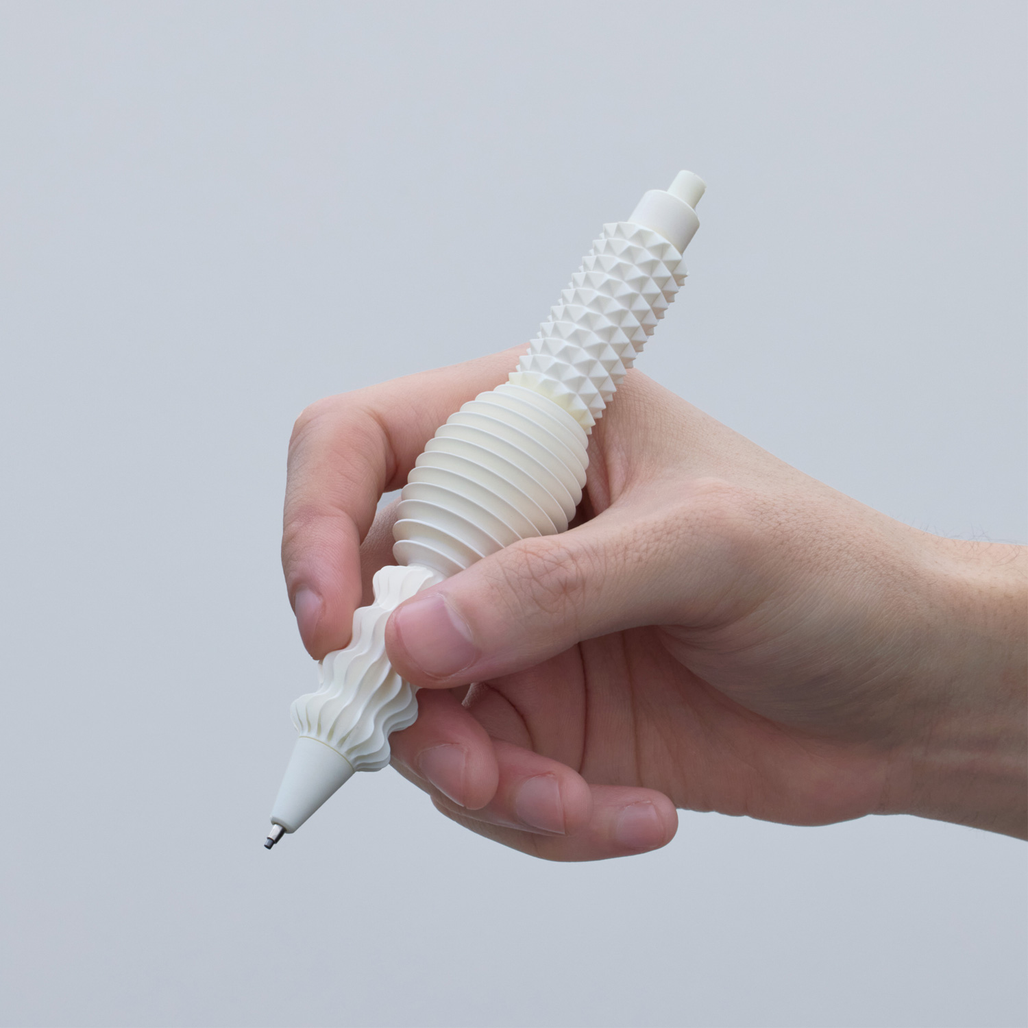 Kawada: I hadn't clearly decided. However, I'd already decided on an approach based on one of the five senses, "the sense of touch," from the beginning, and this, combined with my own experimental product creation, led me to writing instruments. A pen is a familiar item that everyone uses, but I thought that by intentionally providing a "stimulus" that resists its comfort and familiarity in the hand, I might paradoxically bring out creativity.