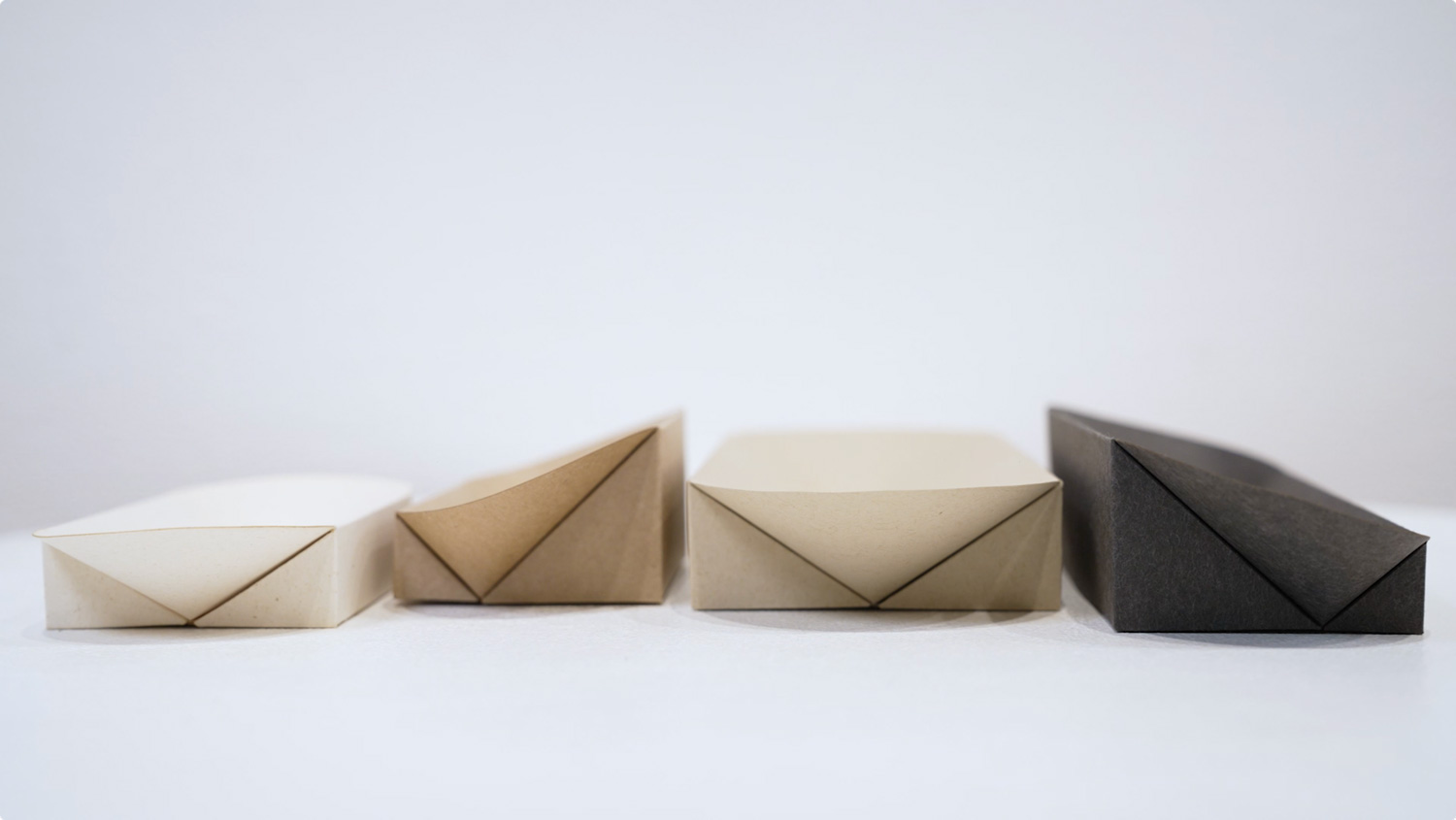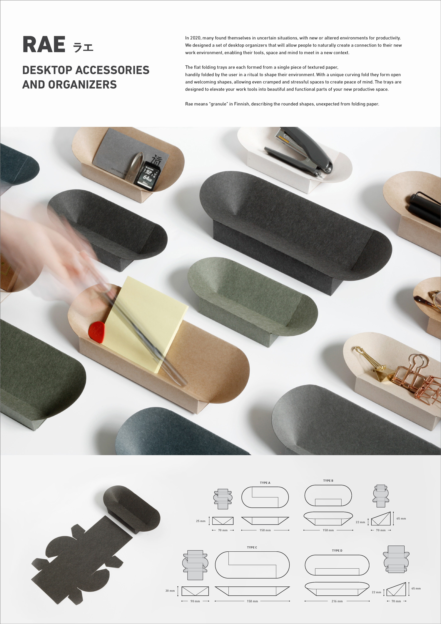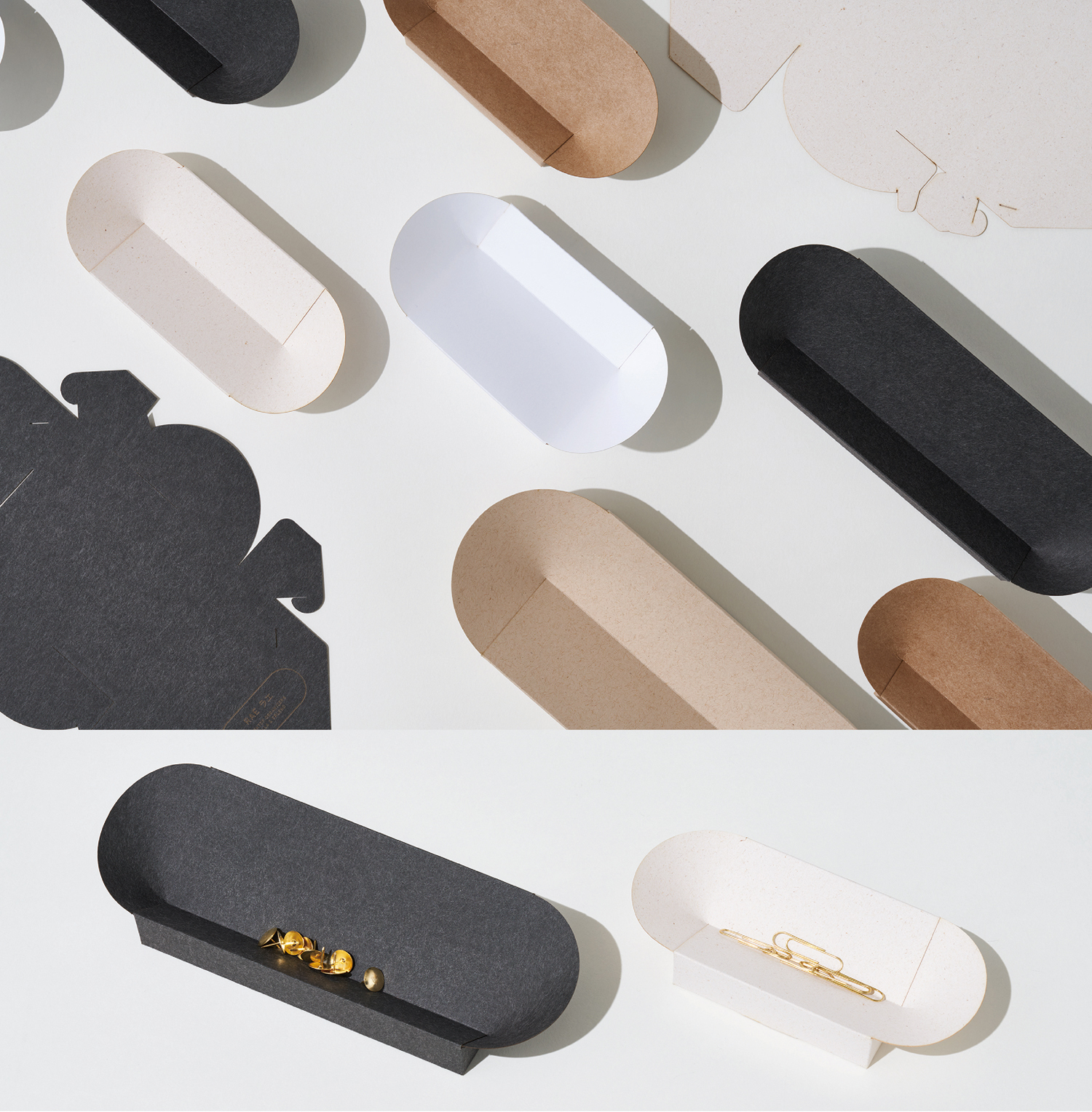 This time, we wanted to create desktop organizers that help create a good work environment. They’re not just for when you work from home, but also when you change offices or move house. We wanted them to be flat packed and easily folded into sturdy shapes that also had an appealing visual expression. Therefore, we wanted to bring soft curves into the design and not just hard, straight lines.
