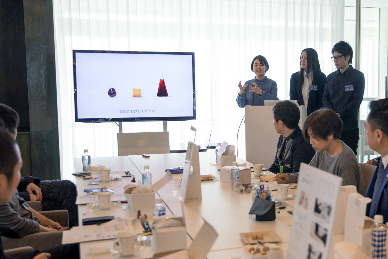 Just like how we use different items of stationery for different purposes, for instance, a pen to write with and a pair of scissors to cut with, the designers came up with a way for us to easily take in the elements we need, like sugar when we feel tired, and caffeine when we need a wake-up call. The three snacks are all bite-size; each has a different shape according to its constituent element and the image it conjures up. They also designed ways in which the snacks can be used, such as sticking them on the office wall. Edible samples were distributed during the presentation, giving the judges their first chance to "evaluate with taste" since the award began.