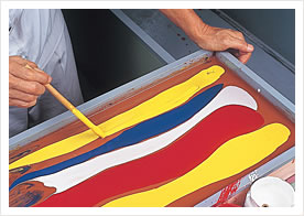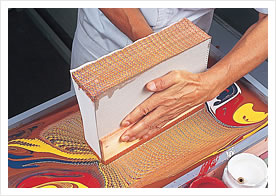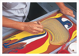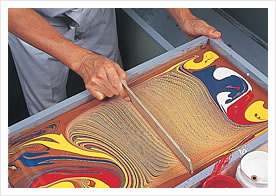 Various marble patterns are created by moving a comb in the mixed paint. The artisan's skills are especially tested here.