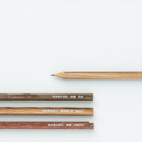 Pencil | This pencil has a past life. It is crafted from scrap wood that should have already disappeared from the world. The address and material name written on the side of the pencil tell the location of the former building and piece of furniture that this scrap wood was part of. The uneven feel and stiffness, that faint scent, the scratches, those tan lines, the color of the paint, the grain... You will find that each individual pencil is like no other, from the instant you first hold it. Memories only known to this wood are transferred to the pencil, and will live on. Try to picture some time that is not now, and somewhere that is not here. | OBAKE (Natsuki Tomoda, Mai Miura) |