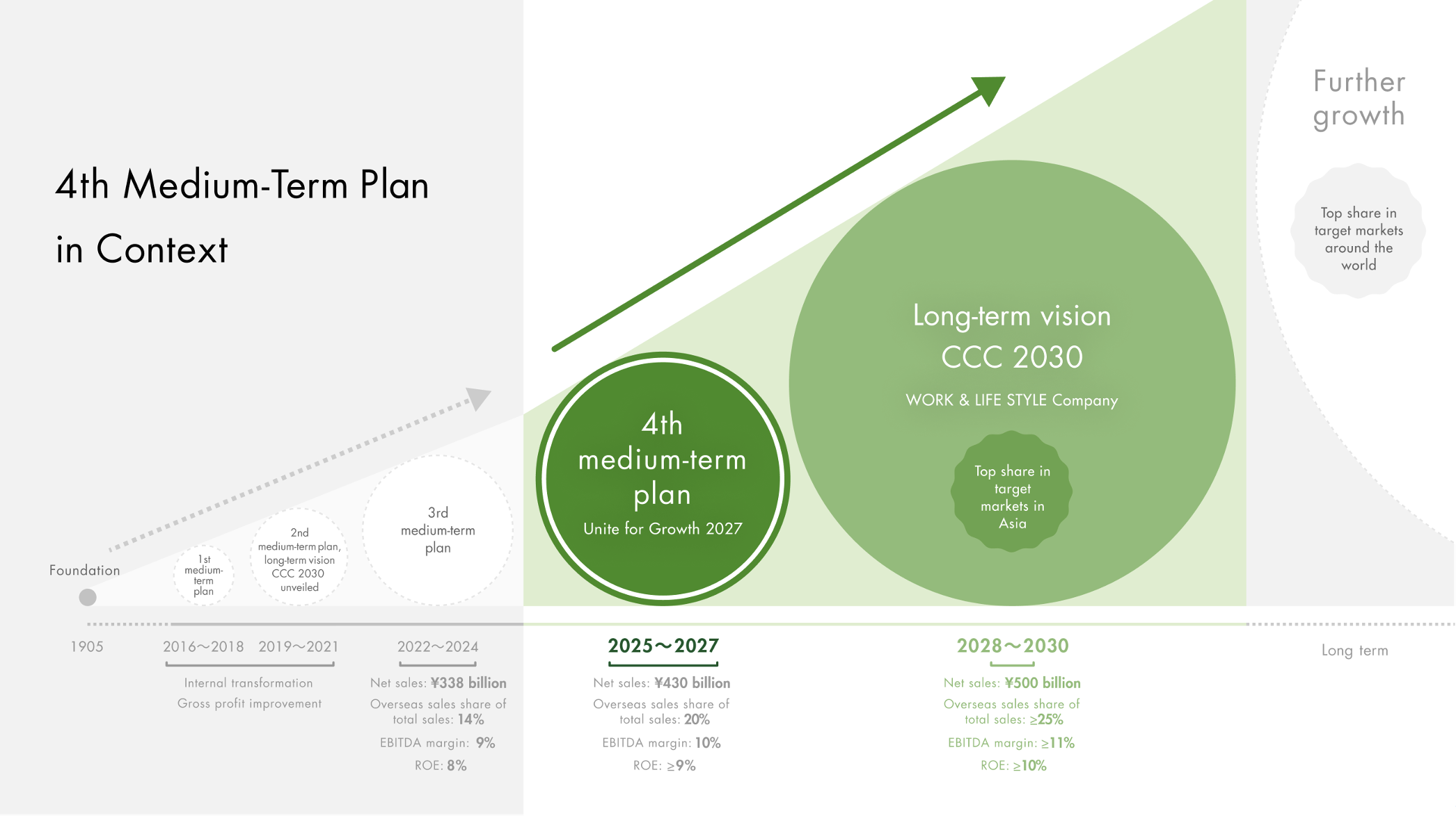 - The fourth medium-term plan has a critical role to play in placing our organization on the path of high growth toward our long-term vision, CCC 2030, and beyond. With this strategic positioning, the plan commits us to the following financial targets for 2027, the final year of the plan: \430 billion in net sales, 20% of total sales made overseas, \43.0 billion in EBITDA, and at least 9% in ROE.