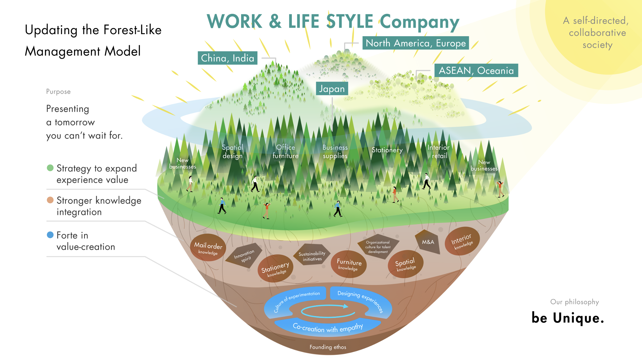 The fourth medium-term plan has a critical role to play in placing our organization on the path of high growth toward our long-term vision, CCC 2030, and beyond. Underpinning this plan is an update to our model for business management—the Forest-Like Management Model. We had previously organized our operations into a workstyle field and lifestyle field and into four business segments: furniture, business supply distribution, stationery, and interior retail. However, with this structure, we never fully leveraged the knowledge assets stored in each business. With our various business assets forming a diverse forest-like ecosystem of sustained growth, we will now focus on combining knowledge assets between the businesses so that they all grow as one whole forest. In other words, we will focus on inter-business synergies to drive efforts to expand the reach of the business fields and expand into global markets.