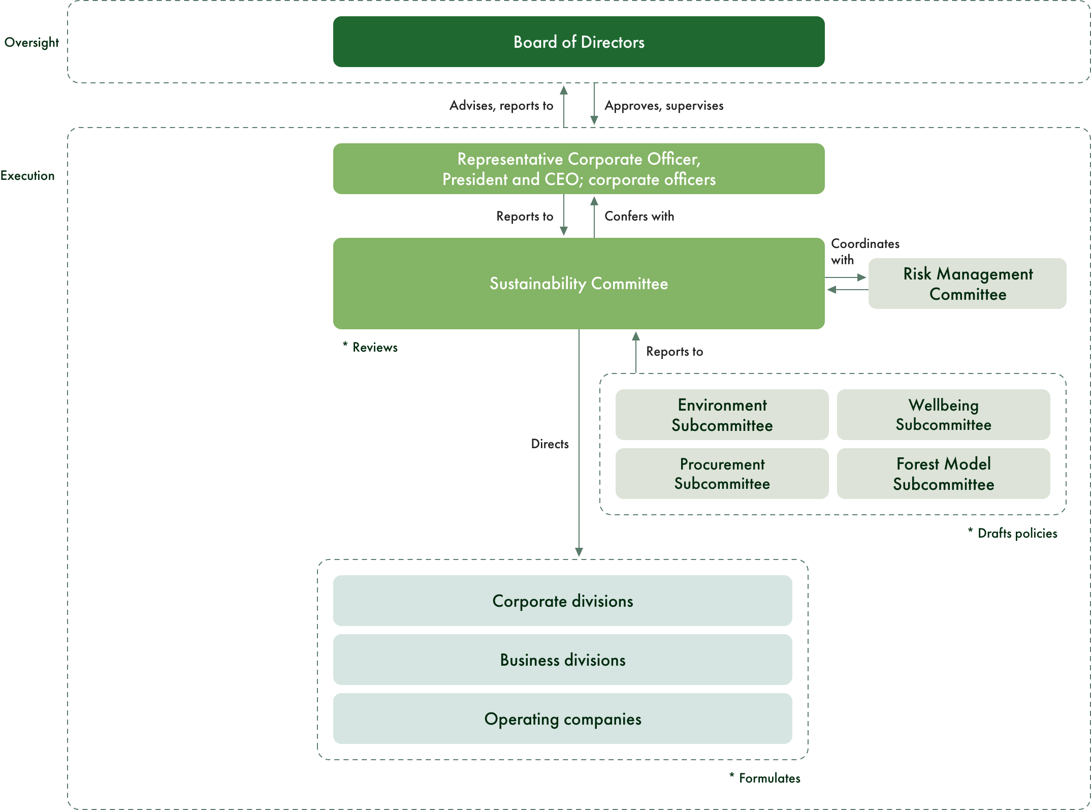 The committee is chaired by the person who is Director, Representative Corporate Officer, President and CEO. Its secretariat is headed by the managing officer in charge of sustainability and its membership comprises every corporate officers and managing officer. The committee consists of four subcommittees, each of which examines a particular area of sustainability and reports its findings to the main committee. The subcommittees are the Environment Subcommittee, Wellbeing Subcommittee, Procurement Subcommittee, and Forest Model Subcommittee.