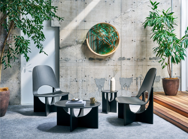 多様な人が集い、交わり、アイデアを共有し合う場に。あるいはお客さまを迎え、もてなす場に。人々がいきいきと過ごす空間にふさわしいプロダクトを揃えたのがym-01シリーズ。存在感のある美しいデザインと、ゆったりとした座り心地を兼ね備えたラウンジチェアーや、その隣によく合うテーブルなど、国産木材の素材感を大切にし、使用後のリサイクルへも配慮したプロダクトを揃えました。