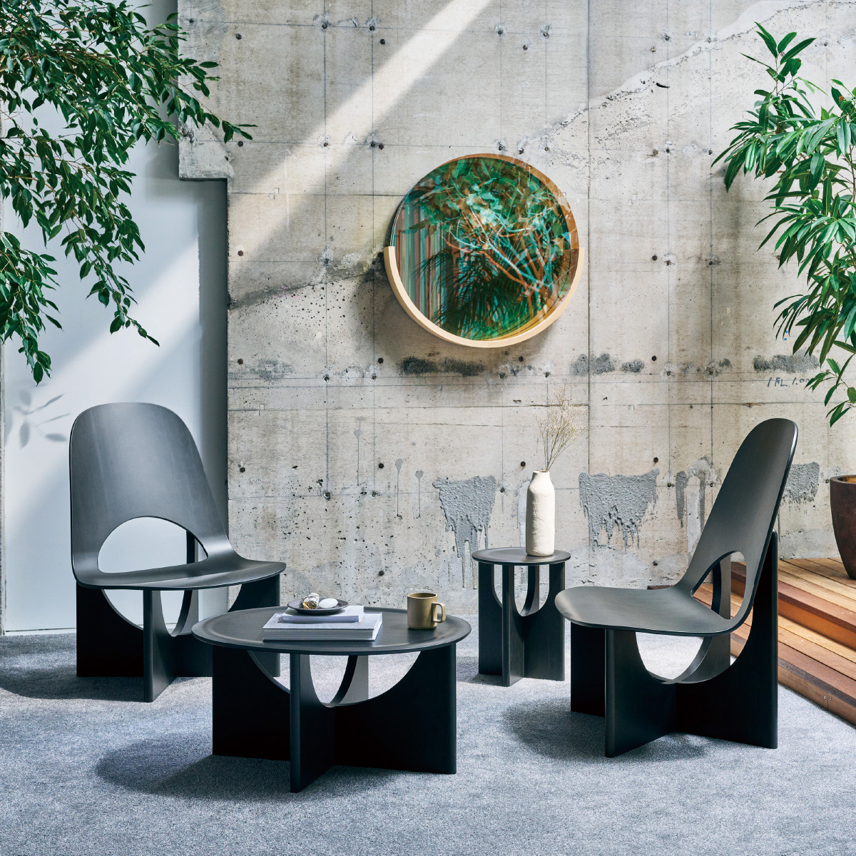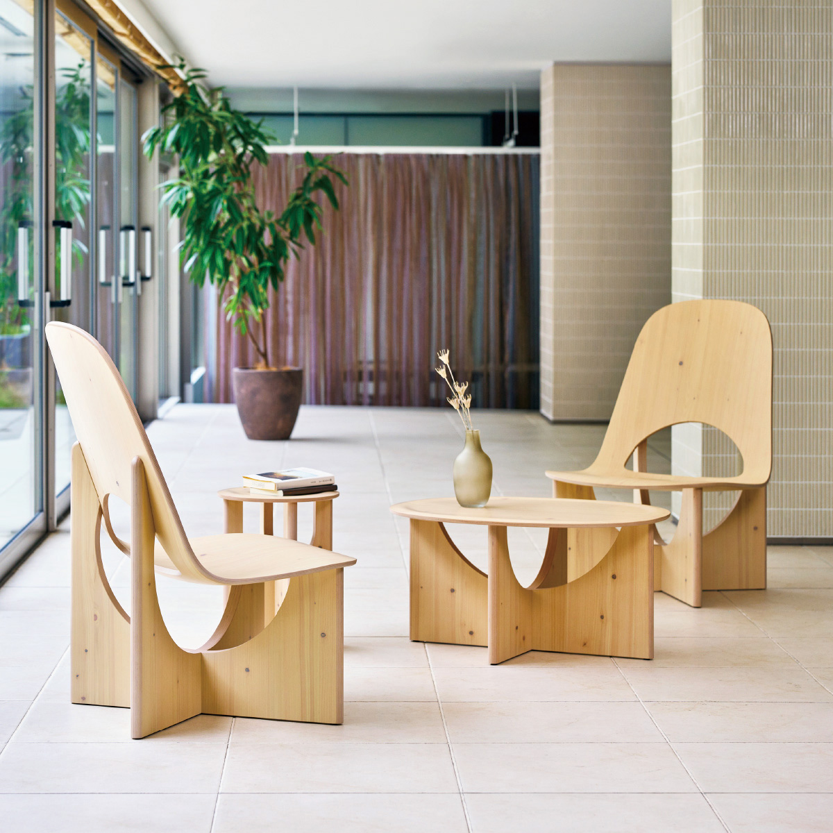 多様な人が集い、交わり、アイデアを共有し合う場に。あるいはお客さまを迎え、もてなす場に。人々がいきいきと過ごす空間にふさわしいプロダクトを揃えたのがym-01シリーズ。存在感のある美しいデザインと、ゆったりとした座り心地を兼ね備えたラウンジチェアーや、その隣によく合うテーブルなど、国産木材の素材感を大切にし、使用後のリサイクルへも配慮したプロダクトを揃えました。