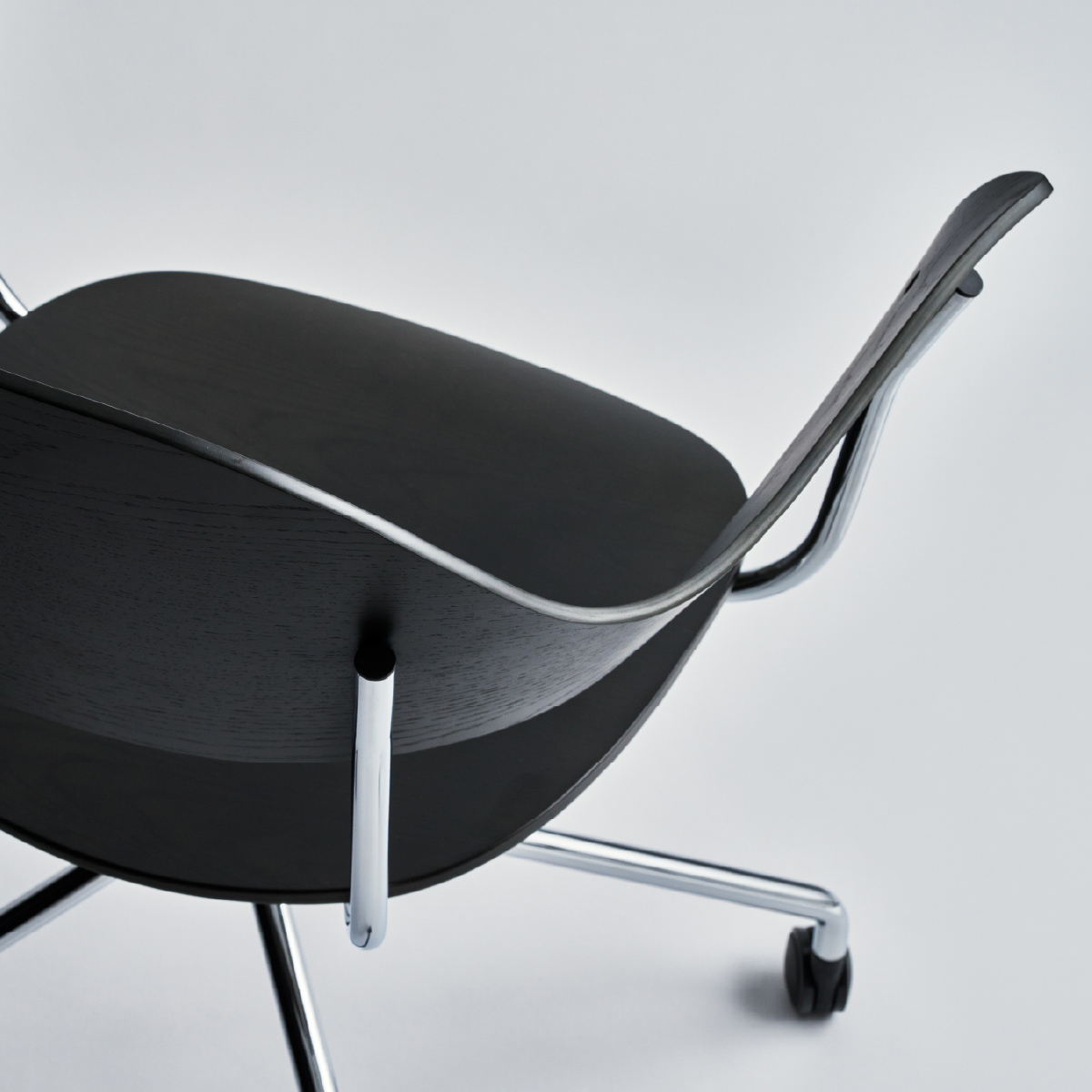 長らくオフィス家具製造に携わってきたコクヨならではの知見を生かし、座の形状には、天然木でありながら、耐圧分散を促し座り心地を高めた形状を取り入れました。キャスター付きの脚部は、可動性に優れています。