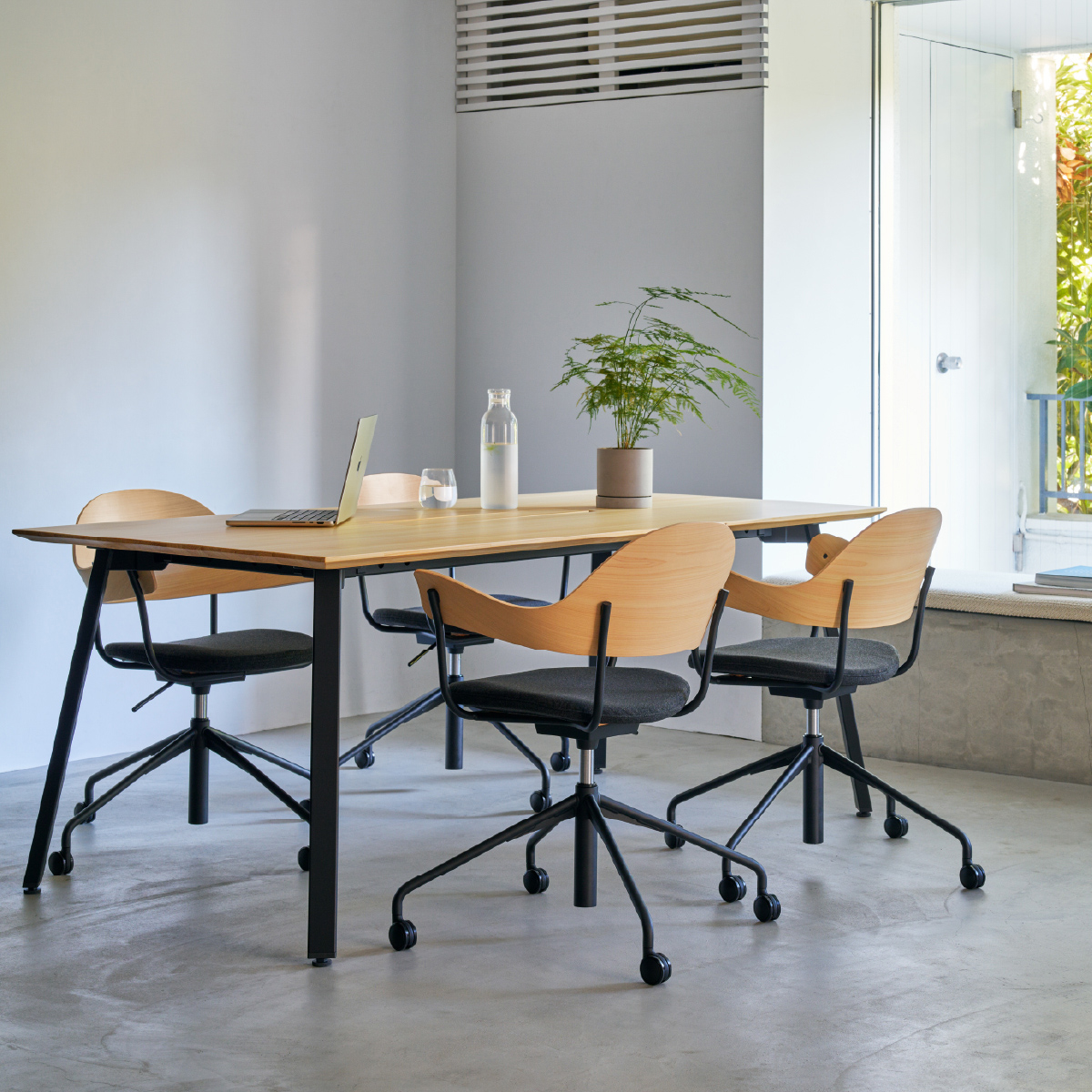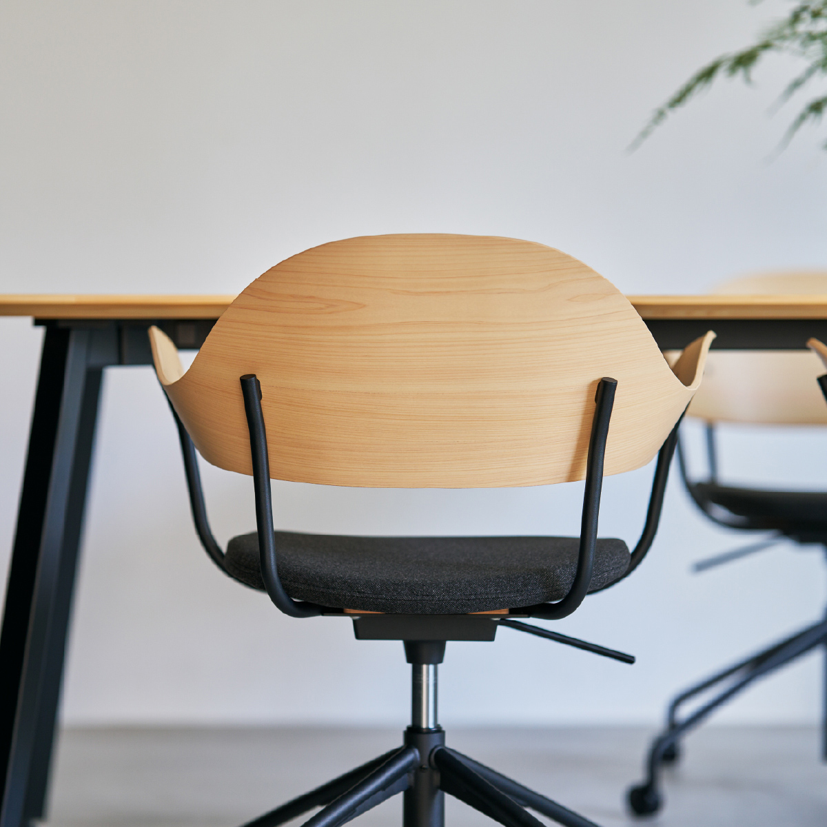 多様な人々が集い、交わる、カフェスペースをイメージして生まれたチェアーシリーズ。アイデアを共有したり、リラックスして一息ついたり、オフィスにおけるさまざまなシーンを彩ります。