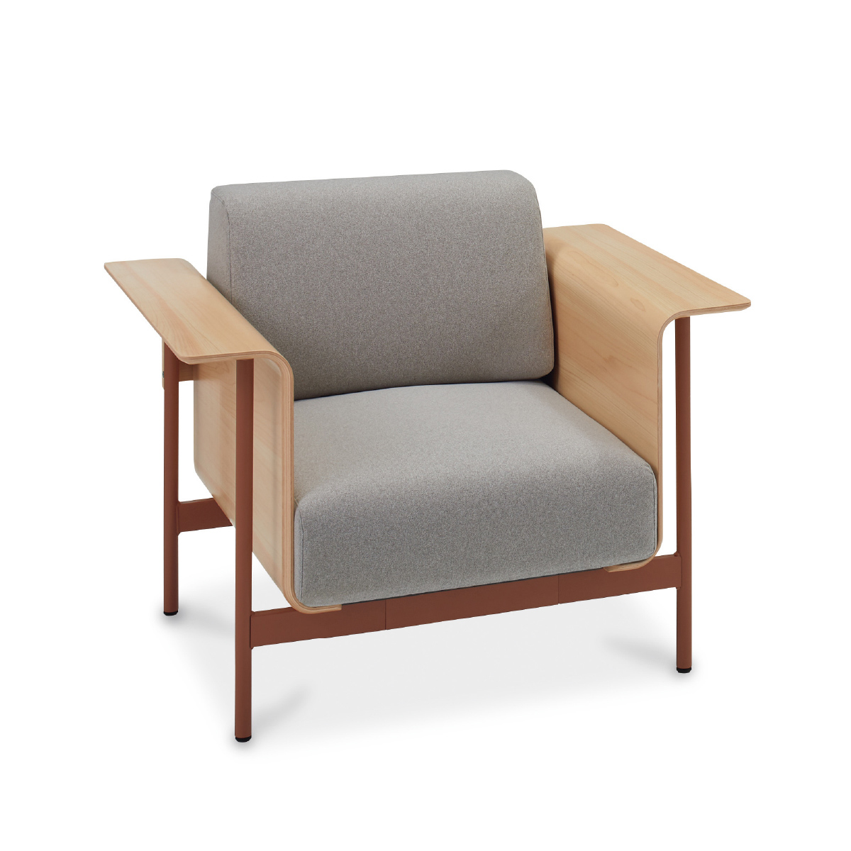 ゆるやかにカーブする木部が目を惹くオーガニックな造形と、オフィスにふさわしい快適な座り心地、そして多彩なシーンに寄り添う90度や135度の連結機能を兼ね備えています。