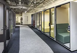 Web会議の会話が漏れてしまう、周りの音で業務に集中できない、声が反響して会話しづらいなど、オフィスの音環境の改善は喫緊の課題となっています。高い遮音性能を持つクローズドブースや吸音素材を用いたオープンブースシステム、吸音パネルなどセキュリティと業務効率向上のための快適な音環境を実現する製品をご体感ください。