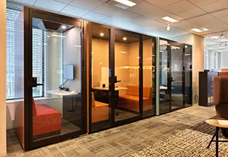 Web会議の会話が漏れてしまう、周りの音で業務に集中できない、声が反響して会話しづらいなど、オフィスの音環境の改善は喫緊の課題となっています。高い遮音性能を持つクローズドブースや吸音素材を用いたオープンブースシステム、吸音パネルなどセキュリティと業務効率向上のための快適な音環境を実現する製品をご体感ください。