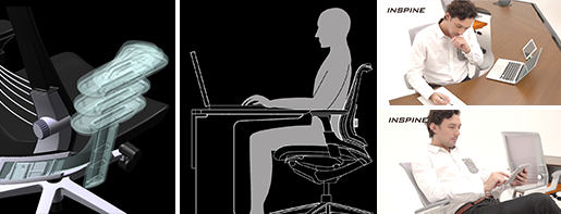 オフィスチェアーは「ツールの変化」「姿勢の変化」に伴い進化してきました。スマートフォンやタブレットの普及と、それらの複合作用の増大により、着座姿勢はこれまでの姿勢と異なる傾向に変化しつつあります。インスパインは、新たな姿勢、新たなツールに対応する最適な機能に着目し、次世代の回転イスを目指して作られました。
