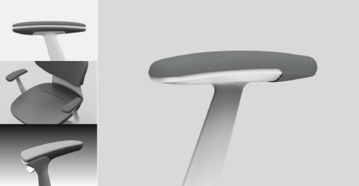 アームなどその他パーツデザインにおいても「360°の動き」を中心に考えデザインされています。従来のチェアでも肘掛けは様々な用途で進化を遂げており、PCワークの腕の体圧分散を行うことや、立ち座りの補助部材などシーティングにおいて重要な役割を果たしています。ingではメインの用途として身体をより効果的に揺らすためのグリップとしてデザインされています。肘先をしっかりと握って体を揺らせるように最適なサイズ形状となっており、裏面に渡って柔らかなウレタン樹脂で成型されています。余計な機能は設けず、安心感のある固定式のグリップアームとしてデザインをしました