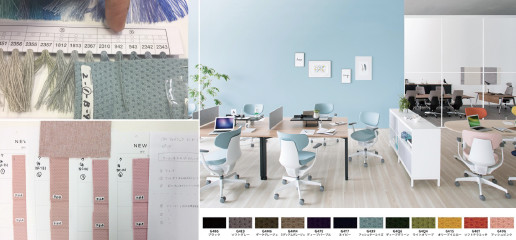 ingのデザイン/素材/カラーはイス単体の視点だけでなく、空間視点での考慮がされています。近年の空間トレンドを分析し選定された12色のニューカラーファブリックは染色から縫製の糸にいたるまで深く検討されています。活気あるミーティングゾーンや落ち着いたシックなマネージメント空間まで幅広いシーンセッティング想定し、多様な空間演出が可能なラインナップとなっています。
