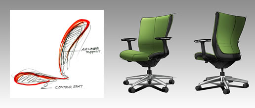 今回はポスチャーサポートシートとエアランバーサポートと言う、特徴的な機能がウレタンクッションや張り地で覆われてしまいます。そこで、あからさまに機能を外観で主張しなくとも、何か機能や座り心地に対する期待感を、外観から感じてもらえるデザインはできないかと考え、「内包する」と言うキーワードを設定しました。最終的に決まったデザイン案のヒントになったのは桜餅や柏餅の様な和菓子でした。ふんわりした皮で、甘くておいしいアンコを包み込んで、隙間からそれが覗いているような様子は、アンコへの期待感を抱かせます。そんな、内部から感じられる期待感をイスのデザインで表現しようと試みました。また、ベースのクッションと張り地によるツートンカラーのデザインは背座のクッションを薄く見せ、張り地の色や質感も引き立てる効果をもたらしました。