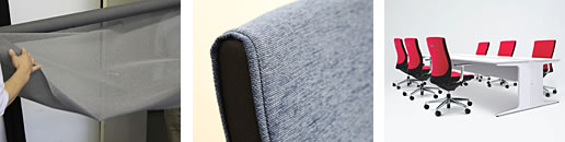 イスがインテリアデザインに影響を及ぼす要素の中に「張り地」があり、張り地一つで空間の印象が大きく変わります。これまではデスクやミーティングエリアなどとのコーディネートを考慮しながら、張り地の選定や、カラー展開を考えていましたが、社内のインテリアデザイナーからは、「インテリアデザインに合わせて、もっと張り地で遊べる(空間を引き立てる)イスがあっても良いのでは?」と、言う意見もあり、「インテリア性をさらに高める」という視点で、どういった張り地が良いのか?色々な張地メーカーのサンプル、カーテンメーカーのサンプル、衣服の張地サンプルを大量に集め、ディスカッションしました。具体的なデザインモデルを用いてヒアリングをしている中で、起毛した張り地に対して「高級感がある」「インテリア性(ホーム的要素)があるので良い」と、言った声が多く、スタンダードなプレーンな張り地と、起毛した張り地に方向性を絞り、さらに検証進めていきました。