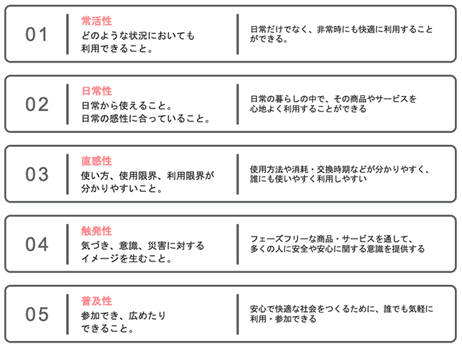 フェーズフリーとは、平常時(日常時)や災害時(非常時)などのフェーズ(社会の概念)に関わらず、適切な生活の質を確保しようとする概念です。この概念は、フェーズフリーの以下の5つの原則に基づいた商品、サービスによって実現されます。