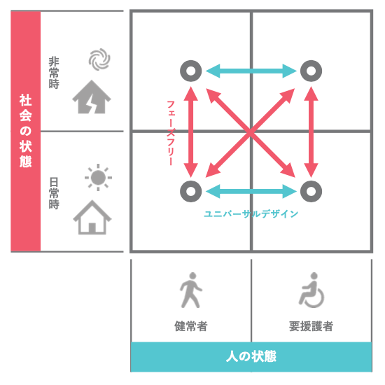 「ユニバーサルデザイン」は<人>の状態をフリーにするもので、「フェーズフリー」は<社会>の状態をフリーにするもの。ユニバーサルデザインというと、本来は心身的障害の有無、年齢や男女、ジェンダー、国籍などを問わず誰もが使いやすいものという意味ですね。一見、フェーズフリーとは関係ないように思えるかもしれませんが、非常時のオフィスの中では、日常においては健常な人も、誰もが要援護者になりえます。ですから、コクヨさんが目指している斜めの方向は、フェーズフリーの視点から言っても理想的だと思います。