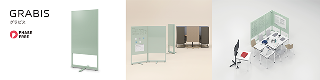 <GRABIS グラビス>は、平時と非常時で異なるニーズを1つにまとめたものです。非常時には情報整理のためあちこちからかき集められるホワイトボードですが、日常的にはあまり使われない。そのため日常時にはスペースを区切ったり情報セキュリティを確保するために使える、仕切りパネルとしての活用を提案しています。日常的に使ってもらえるよう、デザインも真っ白なホワイトボード然としたものではなく、オフィス以外の空間にも馴染みやすい意匠性を持たせました。