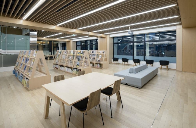 開架スペースの閲覧用席としてソロスを採用しました。島置きの他、本棚両側に単品で設置するなど空間に合わせて多様なレイアウトで配置可能です。ソロスは1人でも動かせるため、スムーズに作業できます。今後は、閲覧席としてだけはなく、行事での使用の可能性もあります。メンテナンス性のよいレザー仕様であることや、隙間が無いデザインで小さなお子様の指挟みなどの心配が無いのもうれしいポイントです。