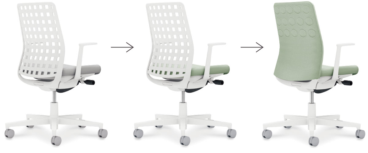 パーツ単位の交換でデザインを変化させることができます。たとえば個人席からラウンジスペースへ。オフィスやインテリアデザインの変化に柔軟に対応し、様々な空間でオフィスの資源であるオフィスチェアーを無駄なく活用することができます。