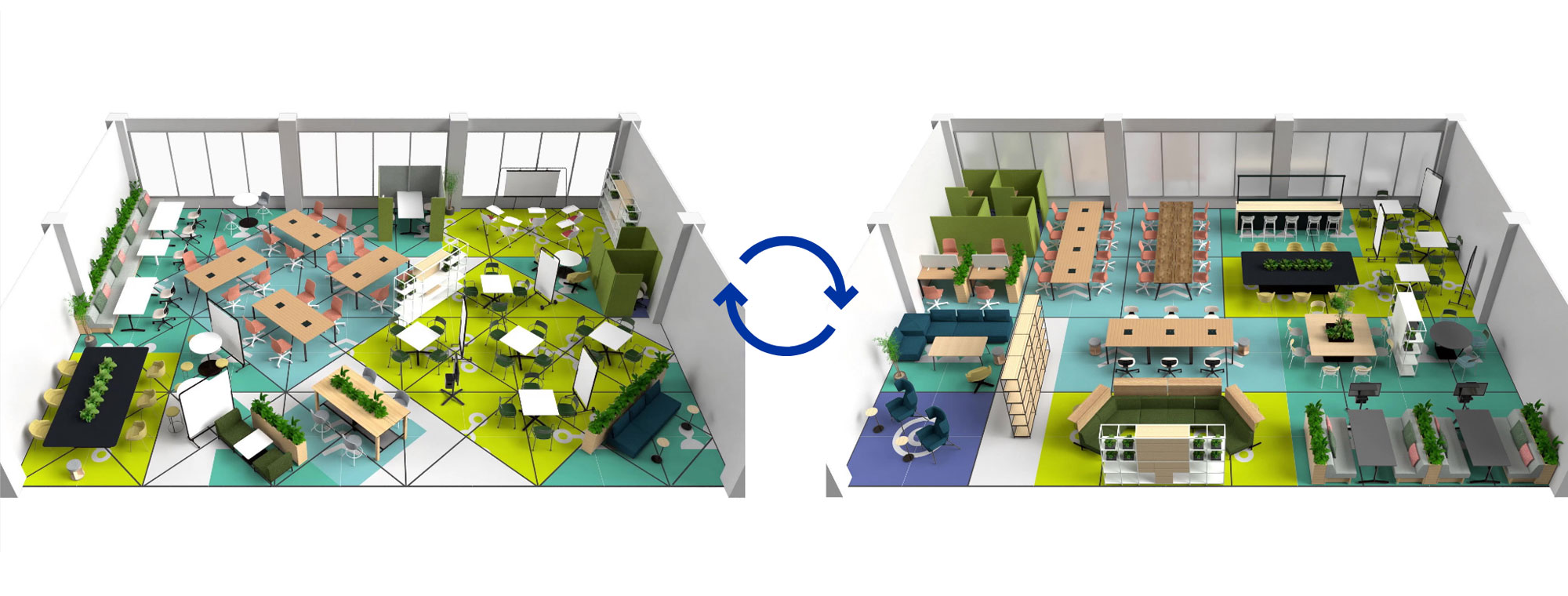 モジュール化したワークシーンの組み合わせで空間をレイアウトし、働き方や組織の変化などに合わせて、組み換えて運用していくオフィスプランニングのご提案です。