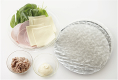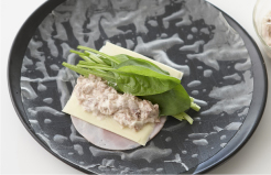 皿の上に広げたライスペーパーの上に、ハム・スライスチーズ・ツナマヨ・サラダほうれん草の葉と茎をのせる。