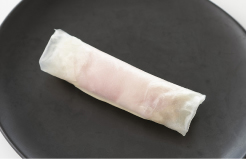 手前からライスペーパーの端をかぶせ、左右を内側に折りしっかり巻き込みながら包む。一口大に切って、できあがり!