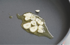 フライパンにオリーブオイルと、にんにくのスライスをいれて、香りをつける。