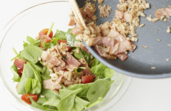 大きく切ったサラダほうれん草とプチトマトにあつあつの
