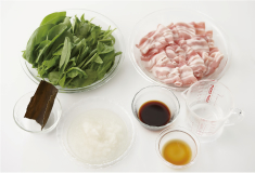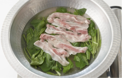 サラダほうれん草と豚バラを広げながらいれて、色が変わったらできあがり!ポン酢に大根おろしをいれて召し上がれ。
