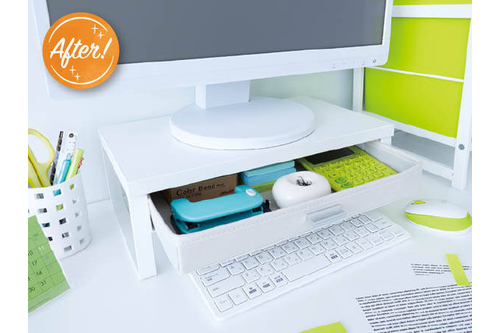 職場やご自宅のデスクの上に、デスクの上に書類や小物、PC周辺機器が散らかっていませんか?。机上台を取り入れるだけで、限られたスペースをぐっと有効活用できます。小物は机上台の引き出しに、キーボードなど下に収めれば、作業スペースが広がり見た目もすっきり。