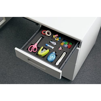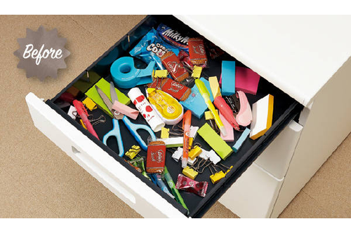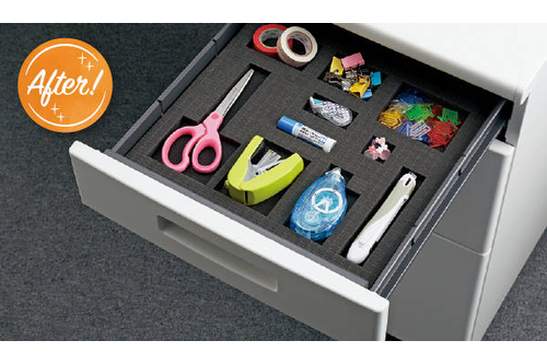 ハサミやノリなどの文具小物は、気づけば引き出しの中でごちゃつきがち。そんな時は定位置を決めることが整理整頓の第一歩です。10mm方眼のミシン目入りで、ツールの形に合わせて簡単に型抜きできるツール管理シートを使えば、引き出しの中もきれいに整います。