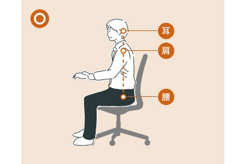 耳ー肩ー腰のアライメントが整っている(一列に並んでいる)状態が重い頭を支えやすい姿勢です。座った姿勢はアライメントが崩れやすく、身体に負担がかかります。