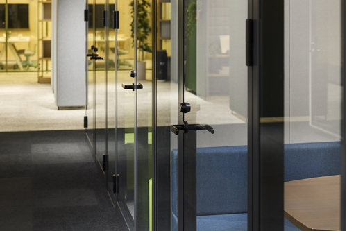 合わせガラスが音漏れに配慮し、集中したい作業や機密性の高いWeb会議にもぴったりの「ワークポッド」。細いフレームを採用することでガラス面を大きく見せ、開放感を持たせているため、オフィスの見通しを遮りません。