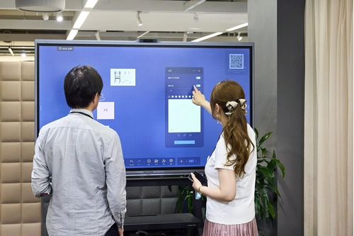 「ブレストをしたいときは、付箋機能がおすすめ。QRコードで送付先を読み込み、各自のスマホからデジタル付箋を送れば、リアルタイムでMAXHUBの画面に表示されます。オンライン/オフラインを問わず議論に参加でき、匿名でも意見が出せるため、自由な発言が促せるでしょう」