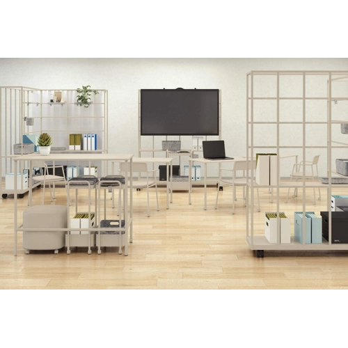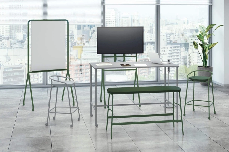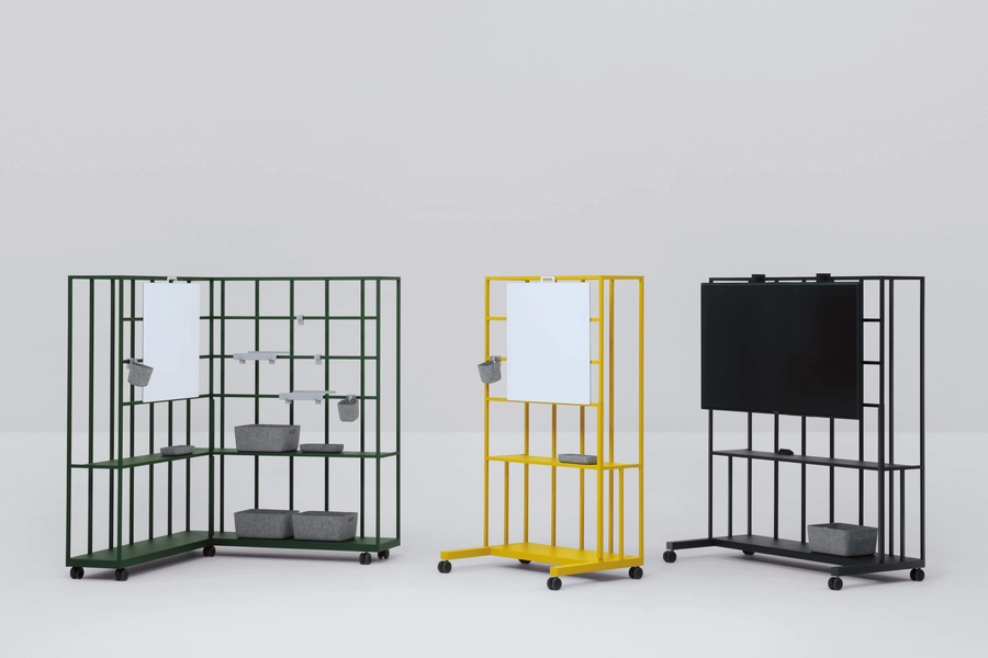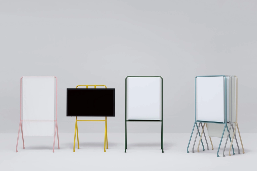エニーツールは、ホワイトボード、ディスプレイスタンド、仕切り用のスクリーンの3種類。キャスター付きなので使いたい場所にさっと動かすことができ、プロジェクトスペースやミーティングで活用できます。空間を邪魔しないシンプルなデザインで、使わないときはスタッキングしてコンパクトに片づけることができます。