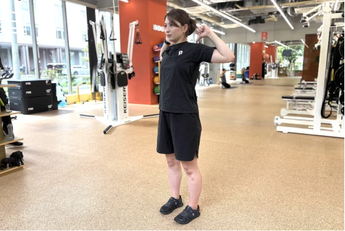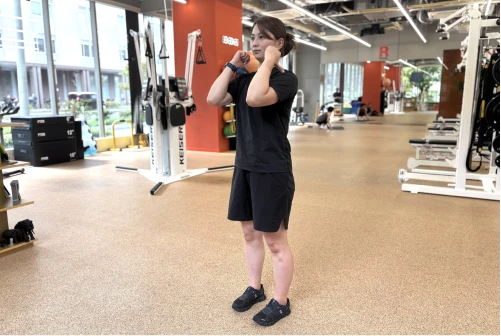 鈴木さん : 背中の後ろで肘を寄せていく時、背中の後ろで肘と肘がくっつくようなイメージで行いましょう。肩関節だけを動かすのではなく、肩甲骨が動いていることを意識してください。