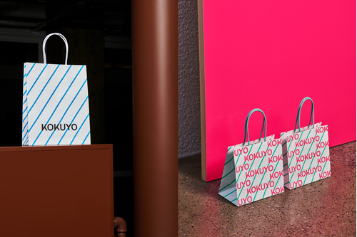 次に紹介されたのは、1917年の「朝日に山桜」を施したマーク以来、幾度かの変遷を経てお披露目となった新ロゴです。核となるのは「K・K・Y」の3文字が等間隔で揃う“斜めグリッド”。この斜めラインがストライプとして無限に展開し、無数のパターンでコクヨの多面性を可視化しています