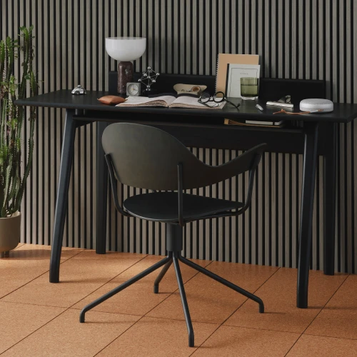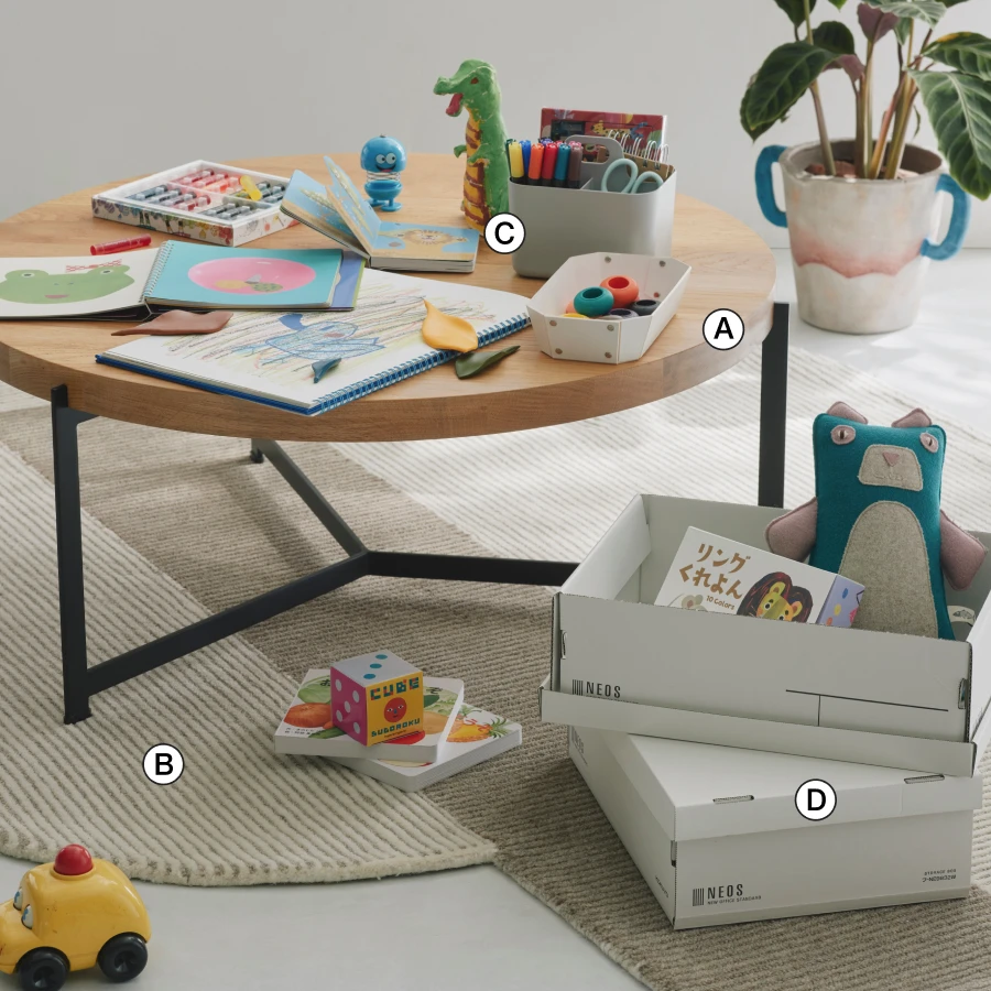 家族のアトリエの主役は、低めの丸テーブル。輪になって座れば、小さな子どもと目線が合い、作品も会話も自然と真ん中へ集まります。厚みのあるオーク材がやわらかな表情を添え、幾何柄のウールラグが創作エリアをゆるく区切って居心地の良さをプラス。散らかる色鉛筆やクレヨンはツールボックスにサッとまとめ、作品はストレージボックスへ。見せたくなるデザイン性の高い収納アイテムで生活感をぐっと抑え、リビングの景色がすっきり整います。