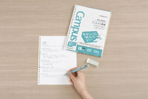 こちらのルーズリーフは紙の繊維からこだわり、通常の紙よりも表面の凸凹を小さくしたコクヨオリジナル原紙です。芯の汚れが残りにくいのできれいに消え、筆記の際はひっかかりが少なく、なめらかな書き心地を実感できます。また、軽い力で消しやすいので、消しゴムの摩擦で紙がシワになったり破れたりしにくくなっています。