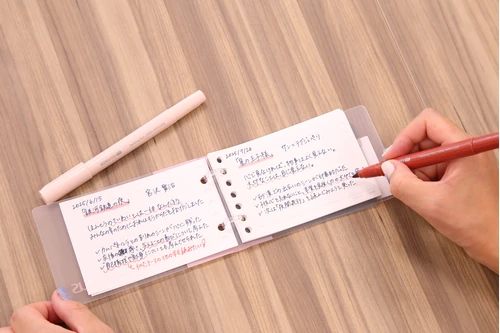 「とにかく簡単に始めたい!」なら、おすすめは「野帳」。持ち運びのしやすさと機能性を兼ね備えたアイテムです。なんといっても薄型でサイズがコンパクトなので、鞄にすぐに収まり、いつでもどこでも気づきをメモできます。紙質も上質なので、書き心地がよく、どんなペンでもマッチします。