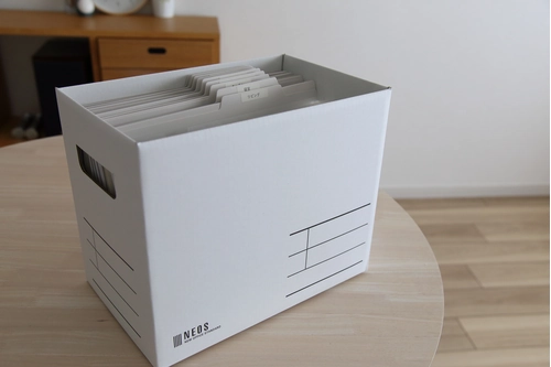 写真で使っているのは、コクヨNEOSのストレージボックスと、個別フォルダー発砲PP製A4サイズ。