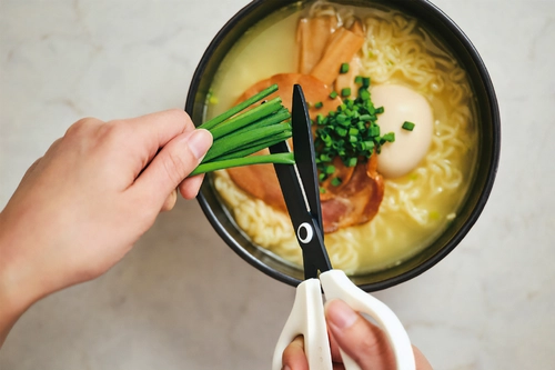 また、出来上がった料理の上に、海苔やネギなどの薬味を直接カットする「チョキ足し」もお手のもの。文具のハサミとさほど変わらない大きさなので料理を華やかにするデコレーション風のカットも自在に楽しむことができます。いつもの料理をより美味しく、より華やかにするひと手間を、より楽にできるのがこの「洗えるハサミ<サクサ>(キッチン・食洗機対応)」なのです。